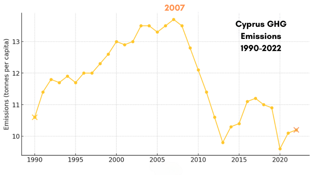 A wider look at Cyprus’ GHG emissions across the 30+ years (figure 2), shows that emissions actually rose from 1990 until the mid-2000s, peaking in 2007 at 13.7 tonnes per capita. They then declined sharply, only to rise again from 2013. The lowest point appears around 2020, likely influenced by the pandemic.