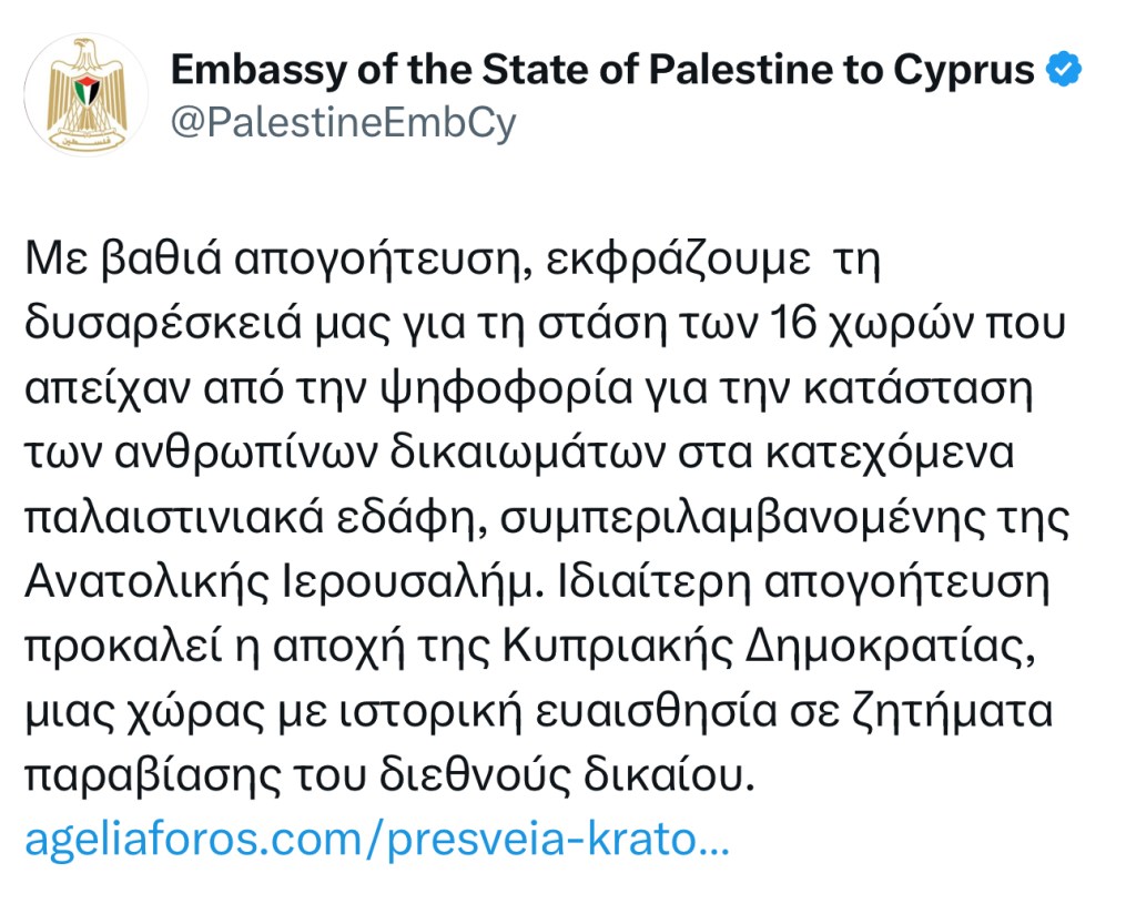 That was how the Embassy of the State of Palestine to Cyprus described Cyprus’ decision to abstain from a UN vote on human rights violations in the occupied Palestinian territories.
